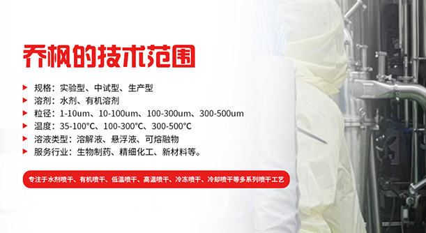 上海喬楓實業有限公司,成立于2012年,是從事噴霧干燥設備的研發設計、生產、銷售(小型噴霧干燥機實驗型噴霧干燥機,35℃低溫噴霧干燥機,有機溶劑噴霧干燥機,低溫閉式循環噴霧干燥機、超細粉末噴霧干燥機噴霧冷凍干燥機真空噴霧干燥機、氣流噴霧干燥機,噴霧造粒干燥機,離心噴霧干燥機,沸騰制粒機等)和售后于一體的綜合性公司,本公司現成為一家致力于為生物制藥、精細化工、新能源、陶瓷造粒及食品工程等領域提供全套解決方案的整線交鑰匙工程企業。